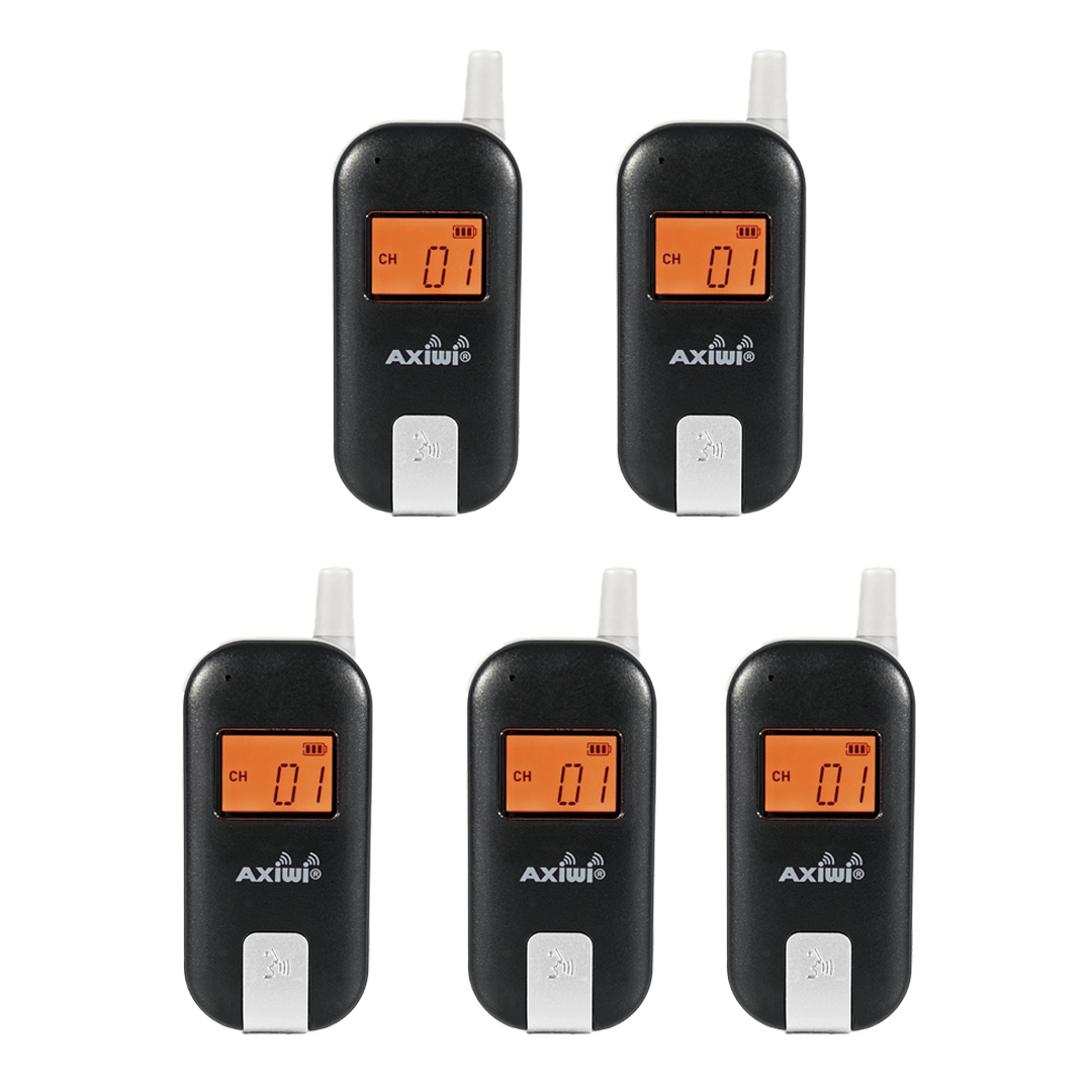 The AXIWI is a miniature, full-duplex, hands-free bidirectional communications system. Six persons may communicate with each other in conference mode, just like during a phone call. Model AT-320 has four conference radio channels, with up to 250 persons able to use a channel simultaneously. In addition, the intercom unit is equipped with a clip and lanyard eye.